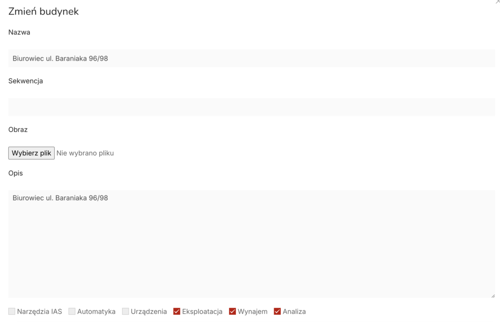 - Zdjęcie – możliwość dodania obrazu reprezentującego budynek.