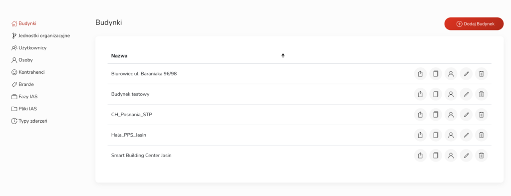 - Widok główny modułu przedstawia listę wszystkich budynków dodanych do systemu.