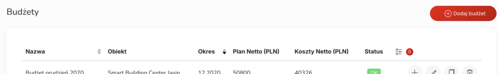 Sekcja przeglądu budżetów pozwala na szybkie wyświetlanie wszystkich budżetów z podstawowymi informacjami, takimi jak: