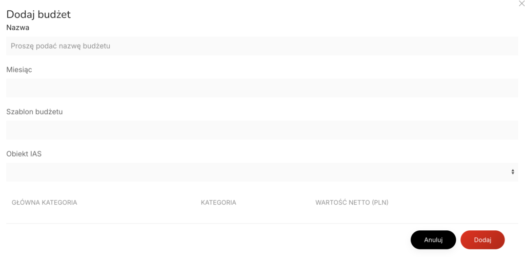 - Wartość netto (PLN) – Kwota netto, która ma być przeznaczona na daną kategorię w danym budżecie.