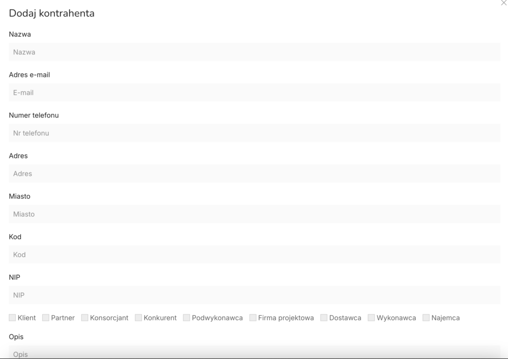 - Kategorii (Klient, Partner, Konsorcjant, Konkurent, Podwykonawca, Firma projektowa, Dostawca, Wykonawca, Najemca)